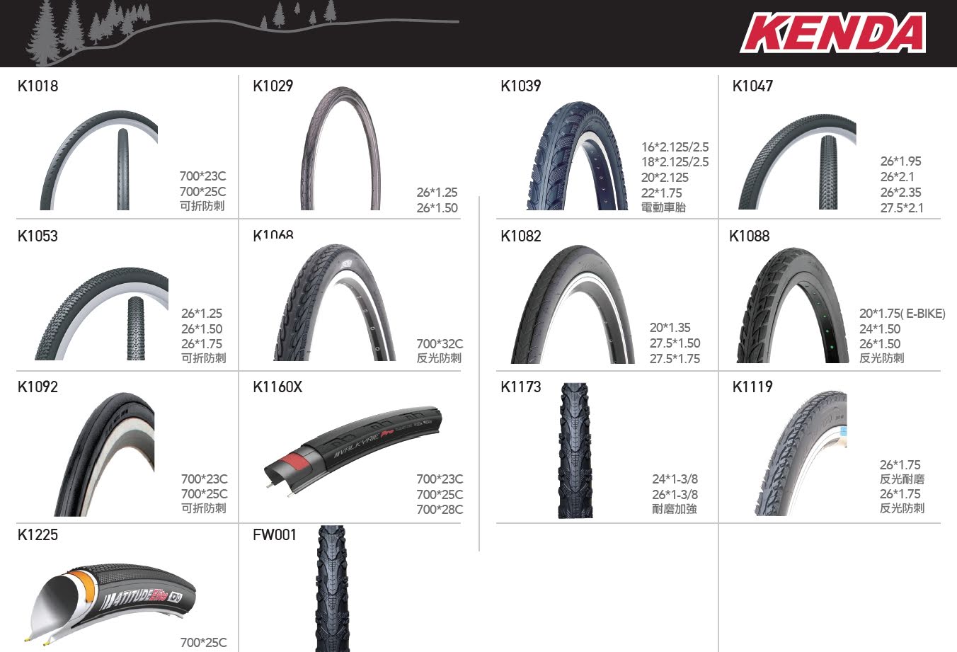 | K1082 | 20*1.35 60TPI 100PSI 防刺 | 黑邊/紅邊/白邊 | 外胎,一般修補 |